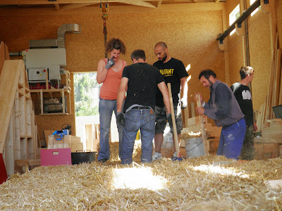 Wie geplant haben wir (Stephan, Johi, Franz, Thomas und ich) heute um sechs Uhr früh angefangen bzw. an den Holz-Strohwänden weitergemacht. Thomas war dabei hauptsächlich mit dem Abbinden (= Zusammenschrauben) der einzelnen Wandelemente beschäftigt, Franz hat die entsprechenden Balken zugeschnitten (Johi auch, aber er hat's ob der frühen Morgenstunde ein-, zweimal ein bisschen versemmelt^^), während Stephan, Johi und ich die Wände mit Rauhspund beplankt haben. Ich habe zum ersten Mal eine riesengroße Nagelpistole in der Hand gehabt und habe mich, glaube ich, ganz gut damit geschlagen (auch wenn ich nur kurz durfte). Das Beplanken der Wände ging ganz gut; dadurch, dass die Wände noch gelegen sind, konnten wir die einzelnen Planken einfach draufschießen und am Schluss gesammelt absägen. Hätten wir die Wände zuerst ins Haus eingebaut und dann beplankt (was uns noch mit der zweiten Seite blühen wird, denn hätten wir alles zugemacht hätten wir ja das Stroh nicht mehr reinbekommen), hätten wir die einzelnen Bretter zuerst genau absägen müssen und dann erst draufnageln, was natürlich viel mühsamer gewesen wäre. So aber haben wir einiges fertiggebracht.